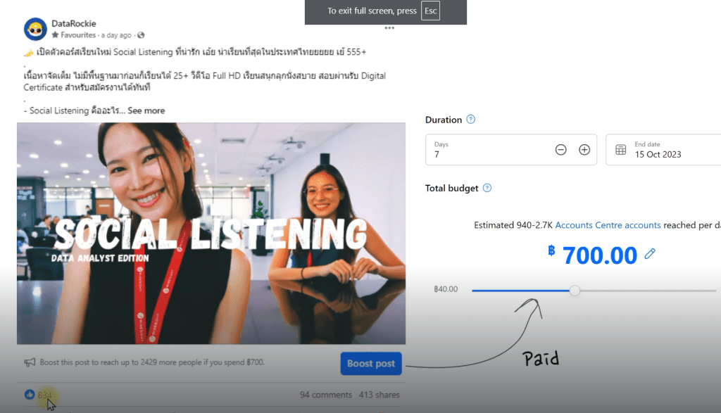 - เราไม่สามารถแยกระหว่าง Organic vs. Paid ได้ นอกจากเราจะเป็นเจ้าของ Page/ Channel นั้นๆถึงจะรู้ว่าโพสต์ไหนบ้างใช้เงินอัดโฆษณา