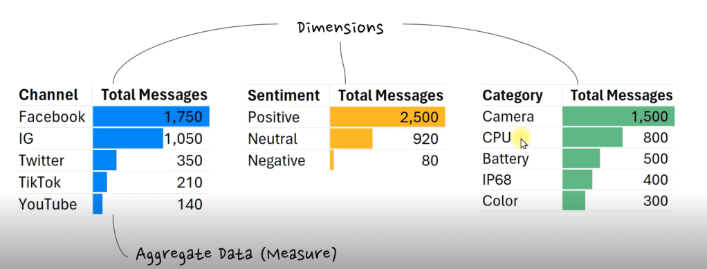 | Dimension | ข้อมูลที่เป็น category เช่น ในตัวอย่างนี้เป็น sentiment |