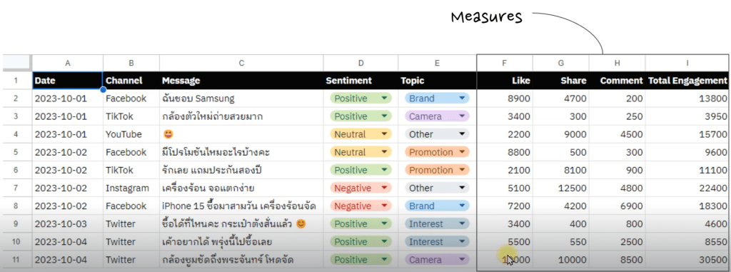 | Measurement | ข้อมูลที่เป็น numeric เช่น ในตัวอย่างนี้เป็น Total Message, Total Engagement |