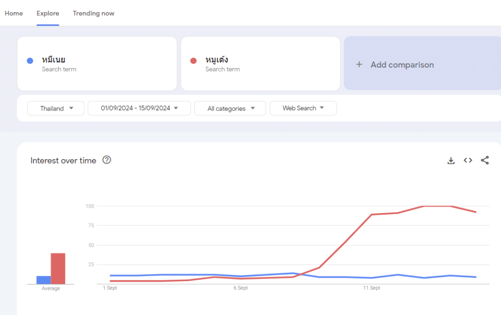 ให้เห็นภาพกันมากขึ้น ลองเอากระแสสุดปังอย่าง ‘หมีเนย’ กับ ‘หมูเด้ง’ มาค้นหาเทรนด์ความนิยม จะเห็นจากกราฟว่าในช่วงวันที่ 09 ก.ย. 68 มีคนให้ความสนใจและเสิร์ชคีย์เวิร์ดคำว่า ‘หมูเด้ง’ มากกว่า ‘หมีเนย’ เกือบเท่าตัว