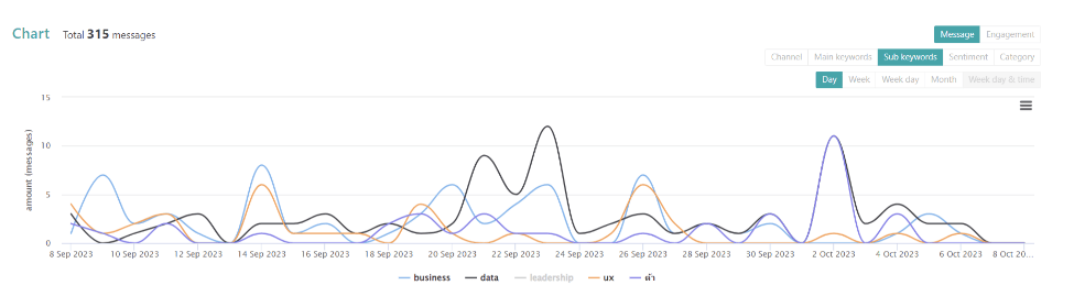 - Line Chart นิยมใช้แสดงผล Time Series เป็น chart หลักที่เราใช้ในการรายงานผล สอง metrics ที่เราดูเทรนด์ในทุกโปรเจ็คคือ message และ engagement