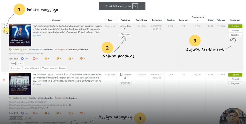 - สามารถดู sentiment ได้ตรง top message engagement ได้เลย