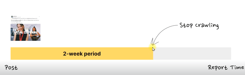เรื่องการ Update ระบบ Social Listening จะมีรอบในการวิ่งกลับไปเก็บข้อมูลล่าสุด เช่น Post วันที่ 1 ก.ย. 2023 จะมีการวิ่งกลับไปเก็บอีกสองครั้งวันที่ 8 และ 15 ก.ย. 2023 หลังจากนั้น ระบบจะหยุดเก็บข้อมูลแล้ว ทำให้ตัวเลขบน Social Media กับใน Report อาจจะไม่ตรงกันเป๊ะ 100%