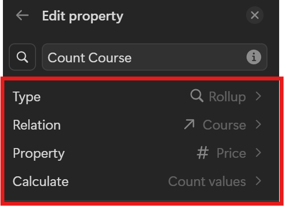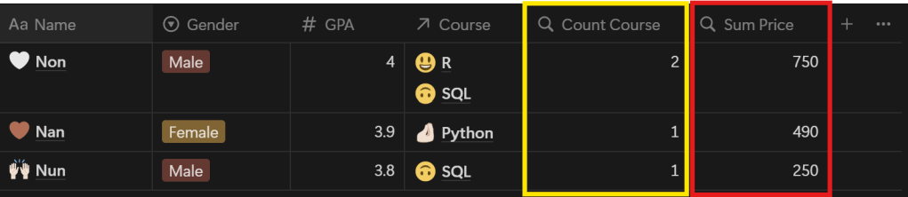 - หากต้องการให้ notion ช่วยคำนวณ Type Rollup แล้วส่ง Database จาก Course table เป็นคำนวณได้ที่ Student Table เพื่อคำนวณค่า Course เรียนดังรูป