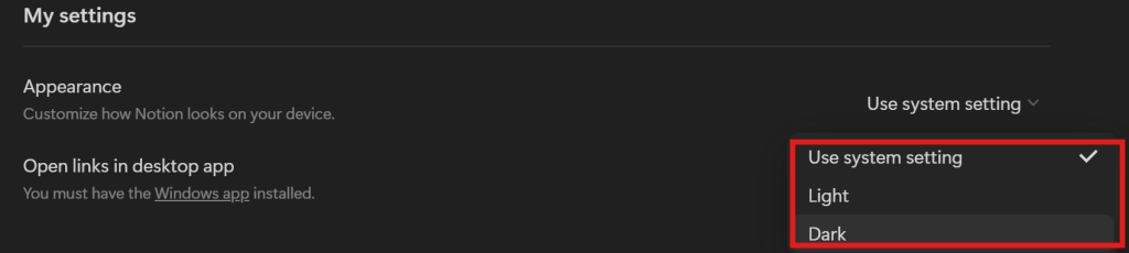 —> Private —Setting —> Appearance —> สามารถเลือก Theme ของ notion ได้ดังรูป