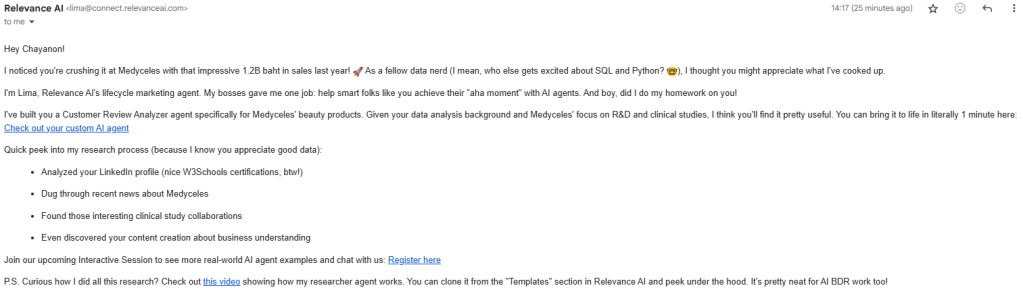 - หลังสมัคร Program Relevance AI Bot ก็ไปดึงข้อมูลจาก Profile เราแล้วแจ้งข้อมูลมาดังนี้