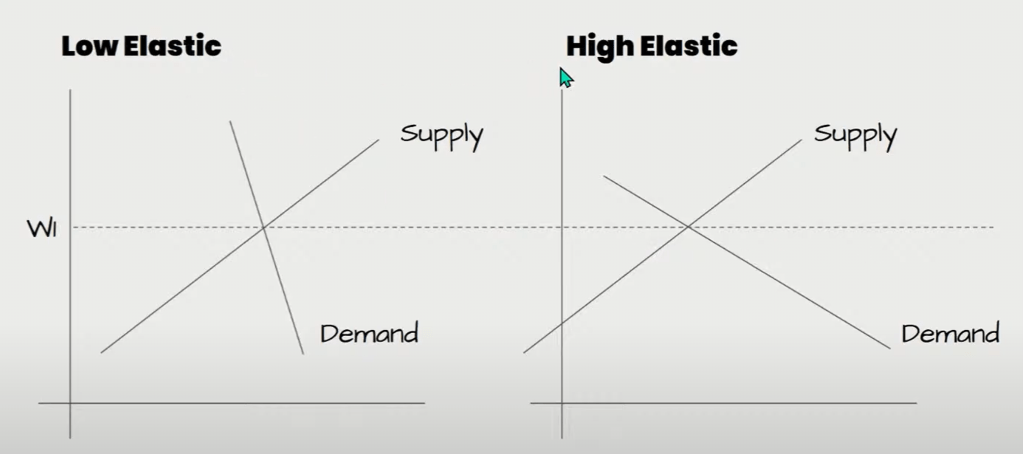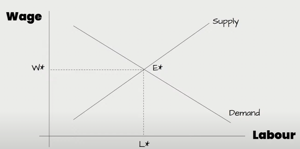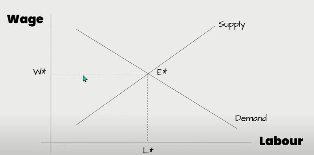 - ตลาดแรงงานจะก็ต้องปรับตัวด้วยการดันราคาตลาดลงมา เพราะคนอยากทำงานมากกว่าความต้องการตลาดจะเกิด Oversupply สิ่งที่ตลาดจะทำคือปรับเงินเดือนต่ำลง เพื่อให้ Demand สูงขึ้น แล้วมา Match ที่จุดดุลยภาพจุด W2 ใหม่
