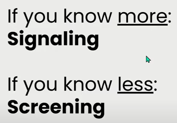 - Signaling เช่น ผู้สัมภาษณ์ส่งข้อมูลเพื่อให้บริษัทรู้เกี่ยวกับประวัติผู้สัมภาษณ์งานมากที่สุด เพื่อที่จะมีโอกาสได้รับการจ้างงานมากขึ้น